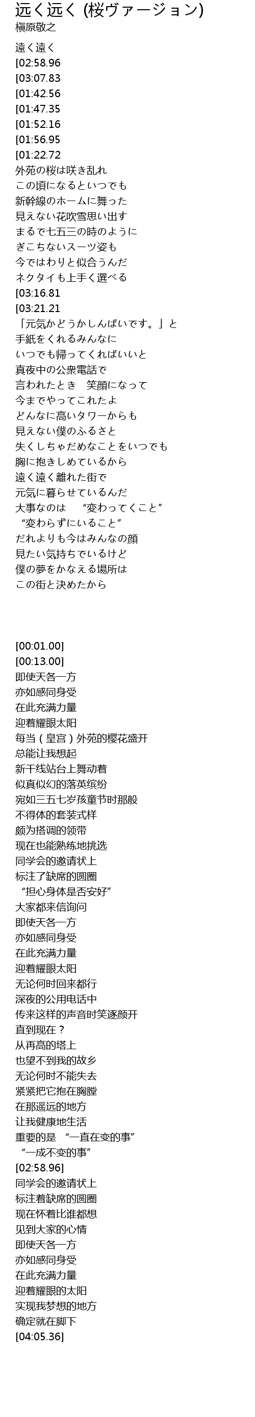 | [00:19.21][01:42.56][03:35.37] | 遠く遠く離れていても |