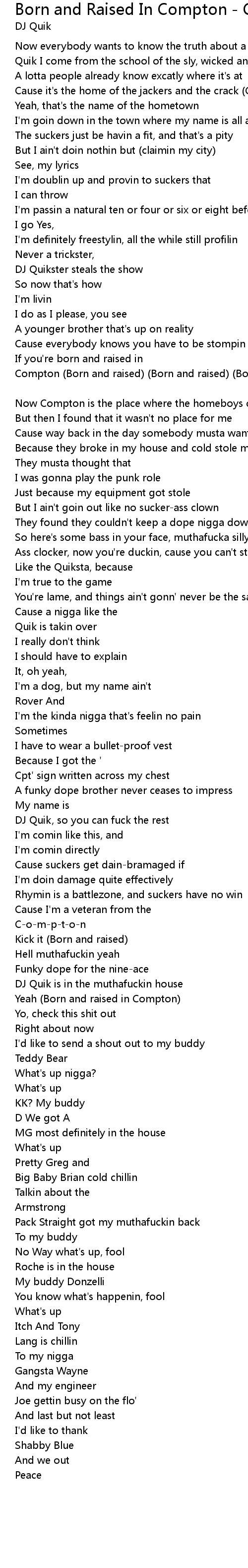 Compton (Born and raised) (Born and raised) (Born and raised in Compton) (Where you from, fool?) (Compton) [ VERSE 2 ] |