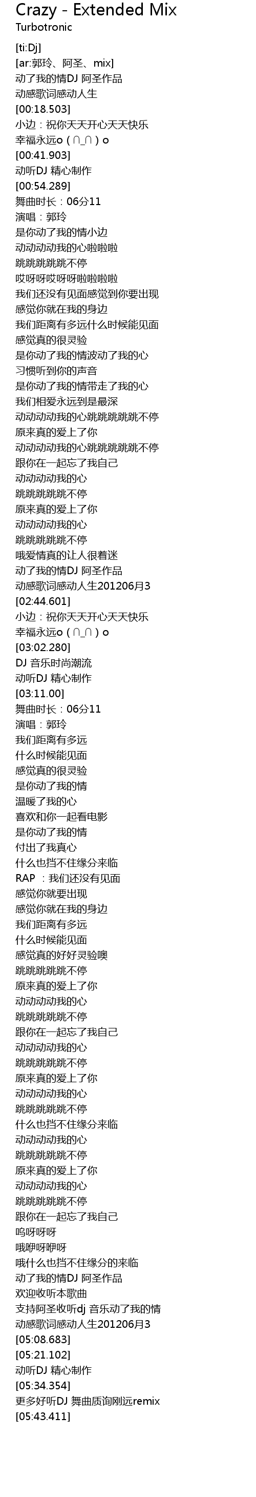 | [05:37.251] | geng duo hao ting DJ wu qu zhi xun gang yuan remix |
