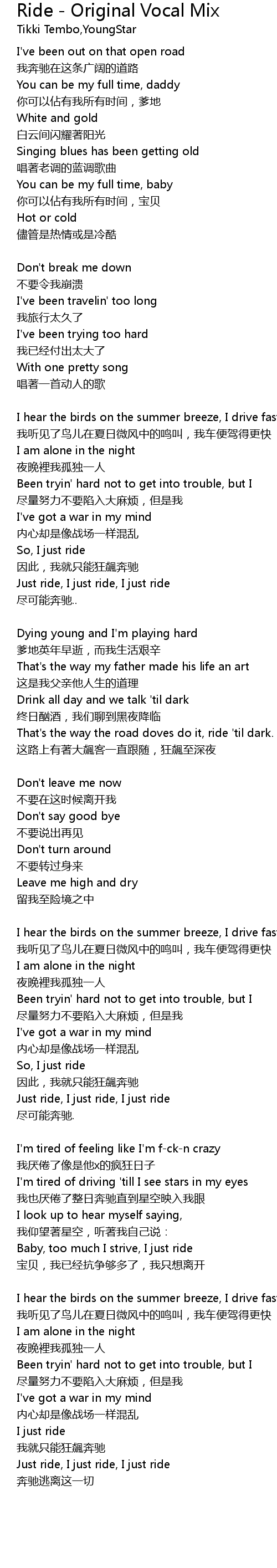 | wǒ tīng jiàn le niǎo ér zài xià rì wēi fēng zhōng de míng jiào, wǒ chē biàn jià dé gèng kuài | |