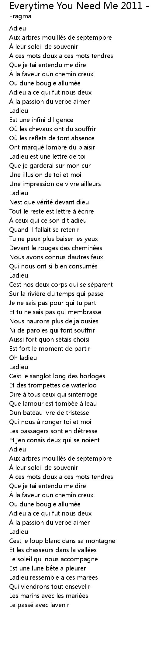 | Song | Everytime You Need Me 2011 - Radio Version |