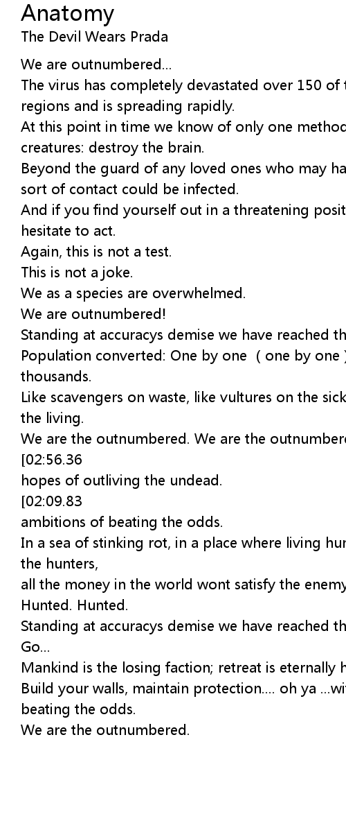 | [03:06.76][02:56.36][01:59.66][01:44.13] | Find your post, find your shelter in hopes of outliving the undead. |