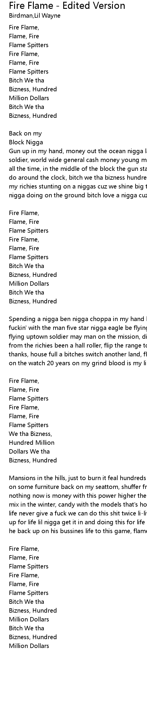 | Gun up in my hand, money out the ocean nigga landing in the sand third war soldier, world wide general cash money young money fire flame spitters hustling all the time, in the middle of the block the gun stay, the money of the top we do around the clock, bitch we tha bizness hundred million dollars, filthy 'bout my richies stunting on a niggas cuz we shine big time flipping another hundred nigga doing on the ground bitch love a nigga cuz' they know we stay fly ridin' 25 on a nigga be hot [Chorus 2x] | |