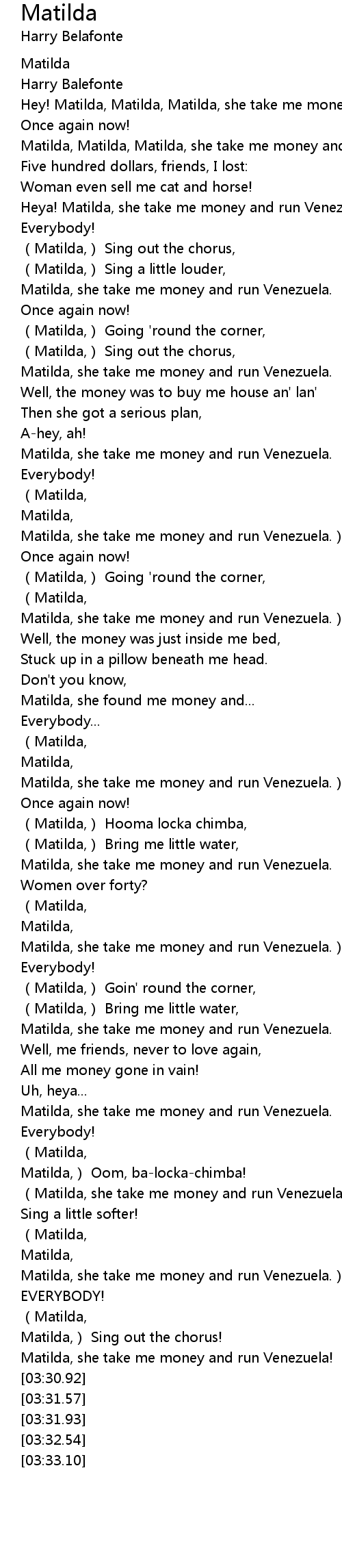 | [00:20.67] | Hey! Matilda, Matilda, Matilda, she take me money and runVenezuela. |
