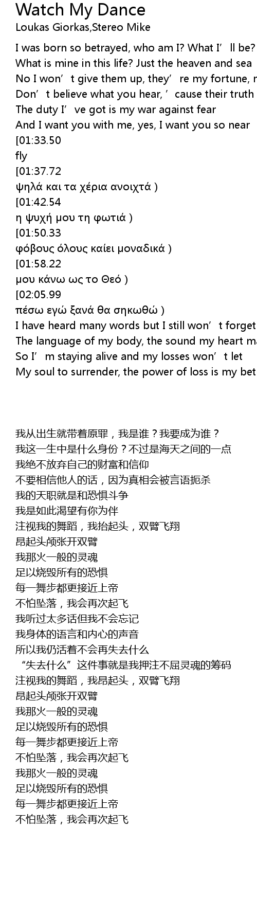 | [00:38.09][01:33.50] | Watch my dance, head up high, hands like wings and I’ll fly |