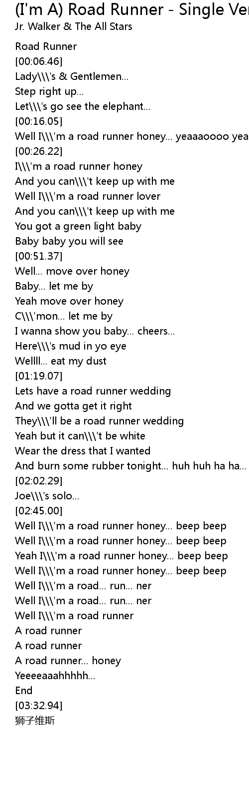 | [02:58.88] | Well I\\\'m a road runner honey... beep beep |