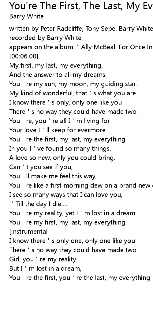 | [02:02.90] | You're my first, my last, my everything. |