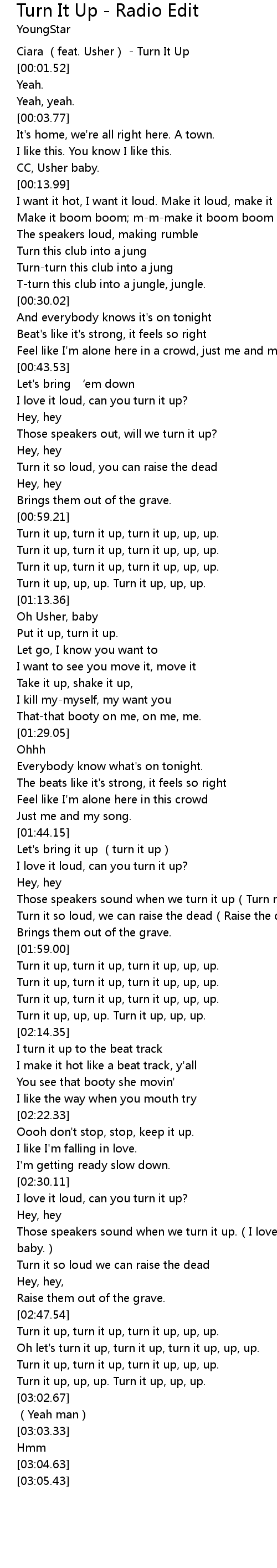| [02:03.24] | Turn it up, turn it up, turn it up, up, up. |