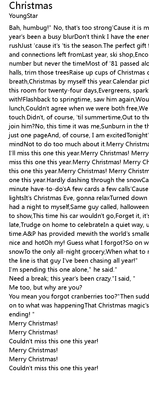 Bah, humbug!" No, that's too strong'Cause it is my favorite holidayBut all this year's been a busy blurDon't think I have the energyTo add to my already mad rushJust 'cause it's 'tis the season.The perfect gift for me would beCompletions and connections left fromLast year, ski shop,Encounter, most interesting.Had his number but never the timeMost of '81 passed along those lines.So deck those halls, trim those treesRaise up cups of Christmas cheer,I just need to catch my breath,Christmas by myself this year.Calendar picture, frozen landscape,Chilled this room for twenty-four days,Evergreens, sparkling snowGet this winter over with!Flashback to springtime, saw him again,Would've been good to go for lunch,Couldn't agree when we were both free,We tried, we said we'd keep in touch.Didn't, of course, 'til summertime,Out to the beach to his boat could I join him?No, this time it was me,Sunburn in the third degree.Now the calendar's just one pageAnd, of course, I am excitedTonight's the night, but I've set my mindNot to do too much about it.Merry Christmas! Merry Christmas!But I think I'll miss this one this year.Merry Christmas! Merry Christmas!But I think I'll miss this one this year.Merry Christmas! Merry Christmas!But I think I'll miss this one this year.Merry Christmas! Merry Christmas!But I think I'll miss this one this year.Hardly dashing through the snowCause I bundled up too tightLast minute have-to-do'sA few cards a few calls'Cause it's r-s-v-pNo thanks, no party lightsIt's Christmas Eve, gonna relaxTurned down all of my invites.Last fall I had a night to myself,Same guy called, halloween party,Waited all night for him to show,This time his car wouldn't go,Forget it, it's cold, it's getting late,Trudge on home to celebrateIn a quiet way, unwindDoing Christmas right this time.A&P has provided mewith the world's smallest turkeyalready in the oven, nice and hotOh my! Guess what I forgot?So on with the boots, back out in the snowTo the only all-night grocery,When what to my wondering eyes should appearIn the line is that guy I've been chasing all year!"