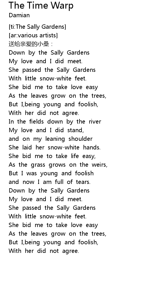 | [03:06.76] | She passed the Sally Gardens |