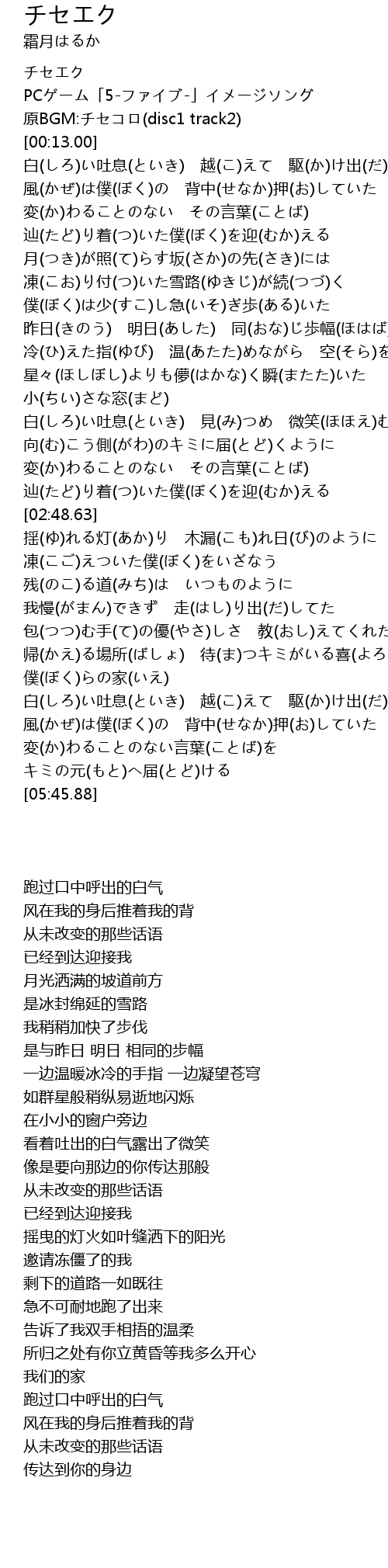 | [00:08.00] | PCゲーム「5-ファイブ-」イメージソング |