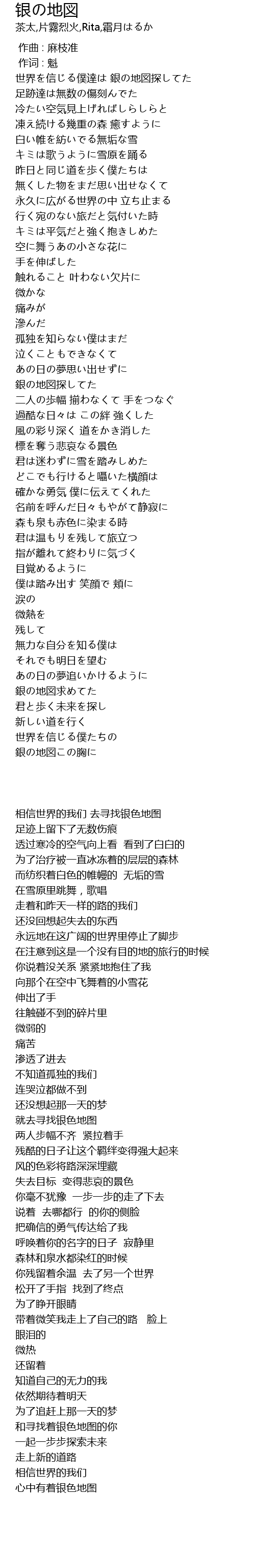 | [00:01.54] | 世界を信じる僕達は 銀の地図探してた |