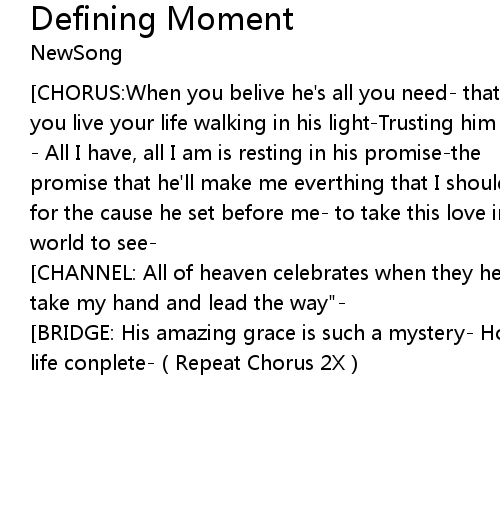 | CHORUS: When you belive he' s all you need that will be your defining momentAs you live your life walking in his lightTrusting him compleatlyThat will be your defining moment All I have, all I am is resting in his promisethe promise that he' ll make me everthing that I should be I will live, I will die, for the cause he set before me to take this love in side my heart for all the world to see | |