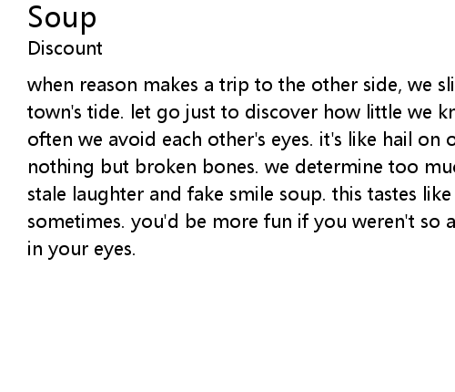 | when reason makes a trip to the other side, we slip under the cover, swim in the town's tide. let go just to discover how little we know about each other, how often we avoid each other's eyes. it's like hail on our backs. we're digging up nothing but broken bones. we determine too much over the telephone. it's like stale laughter and fake smile soup. this tastes like shit. you taste like shit sometimes. you'd be more fun if you weren't so afraid of getting a little salt in your eyes. |