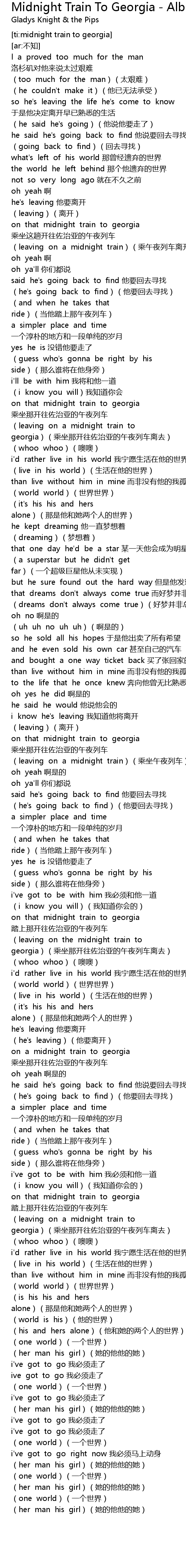 | [02:44.90] | (leaving on the midnight train to georgia)(乘坐那开往佐治亚的午夜列车离去) |