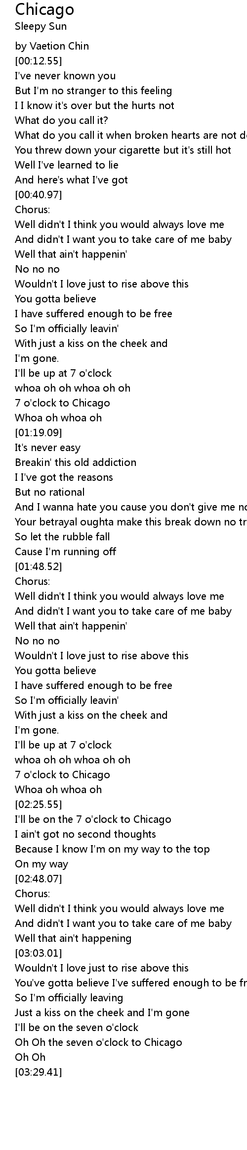 Oh Oh the seven o'clock to Chicago |