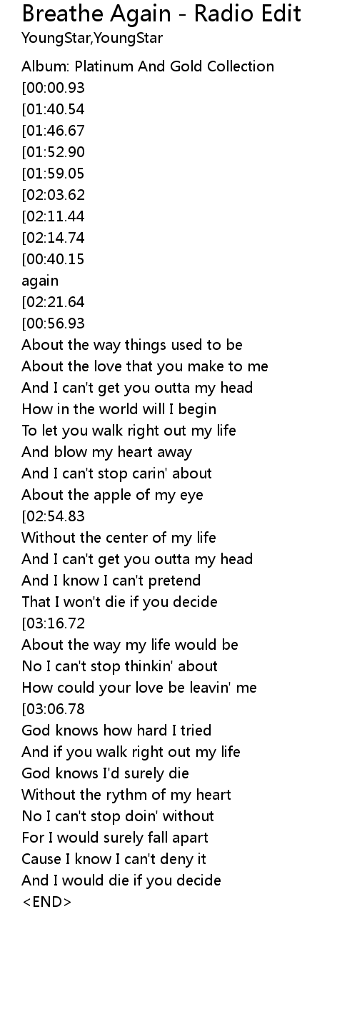 | [00:38.85][00:40.15][00:44.96][02:18.26][02:19.50][02:24.21][03:57.70][03:58.78][04:03.42] | Breathe again |