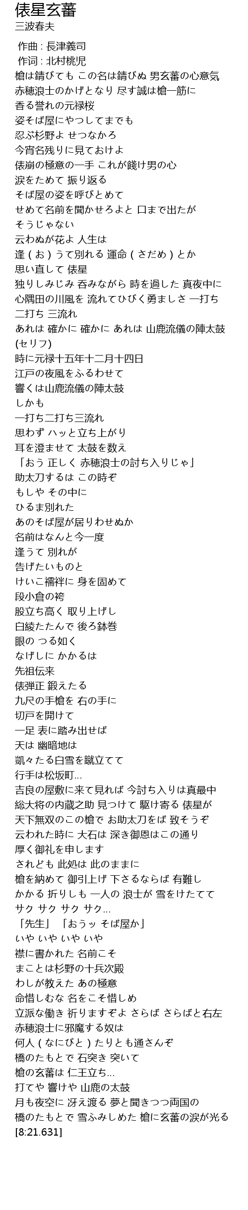 | [0:38.810] | 赤穂浪士のかげとなり 尽す誠は槍一筋に 香る誉れの元禄桜 |