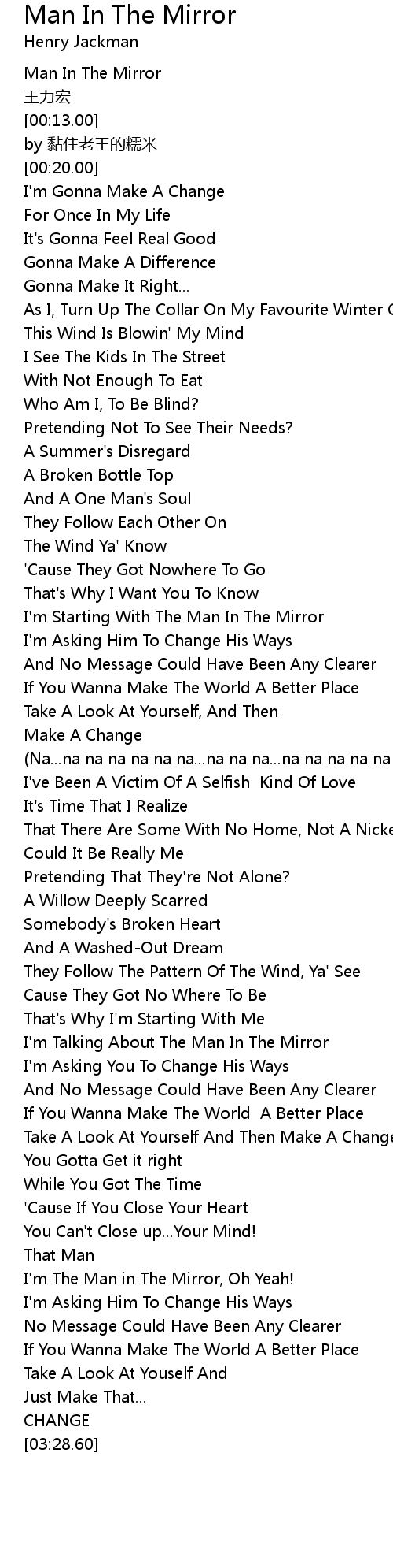 | [03:06.20] | I' m The Man in The Mirror, Oh Yeah! |