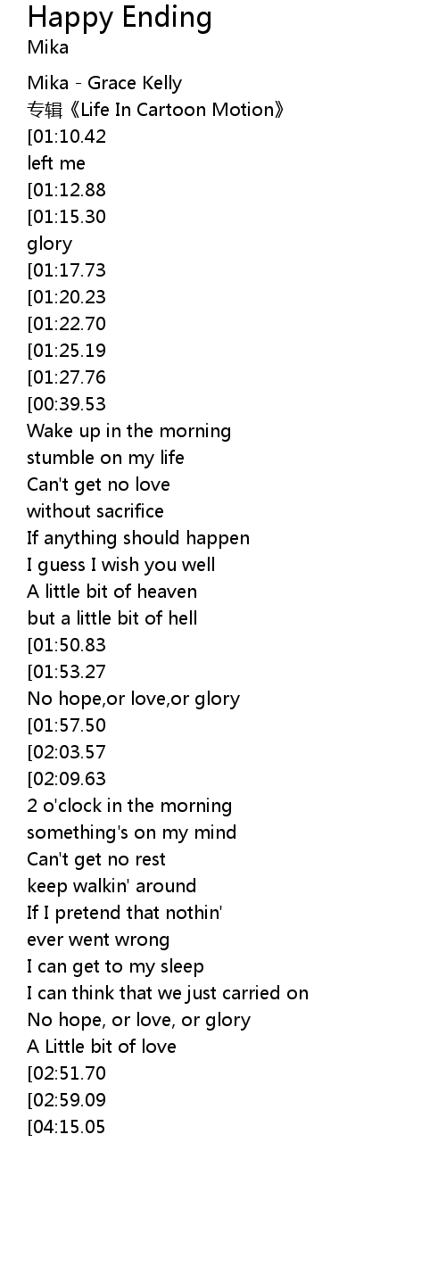 | [00:07.73][01:17.73][02:27.69][03:47.60][04:07.52][04:27.47] | No Happy Ending |