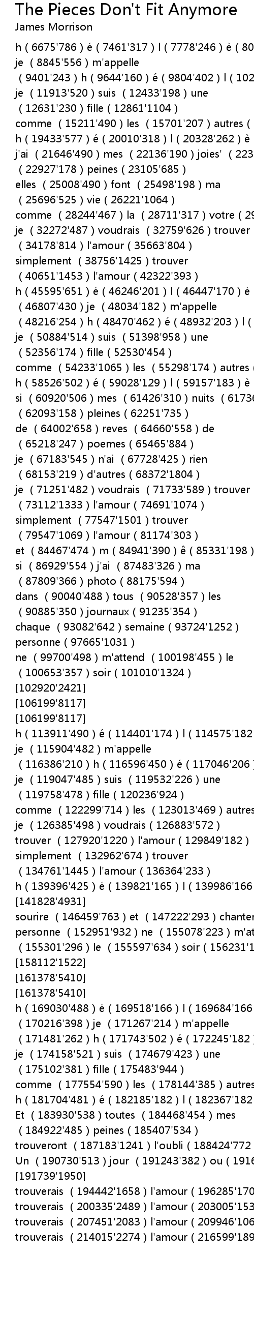 | [21646'2145] | j'ai (21646'490)mes (22136'190)joies' (22326'601)mes (22927'178)peines(23105'685) |