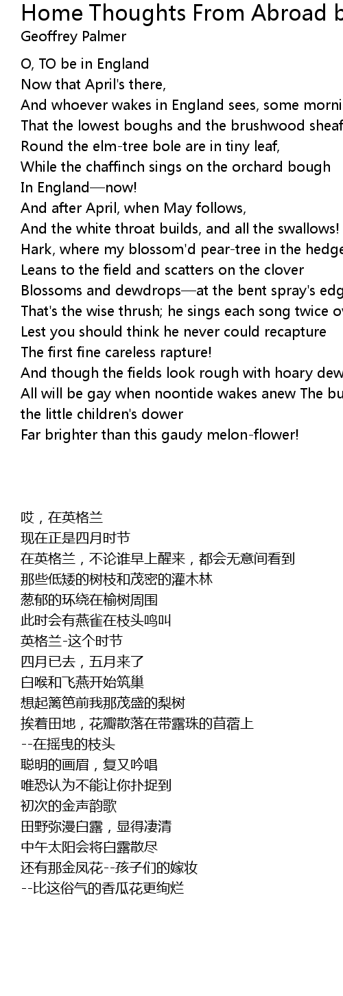 | Song | Home Thoughts From Abroad by Robert Browning. Dvorak - Symphony No.9 2nd Movement (excerpt). |