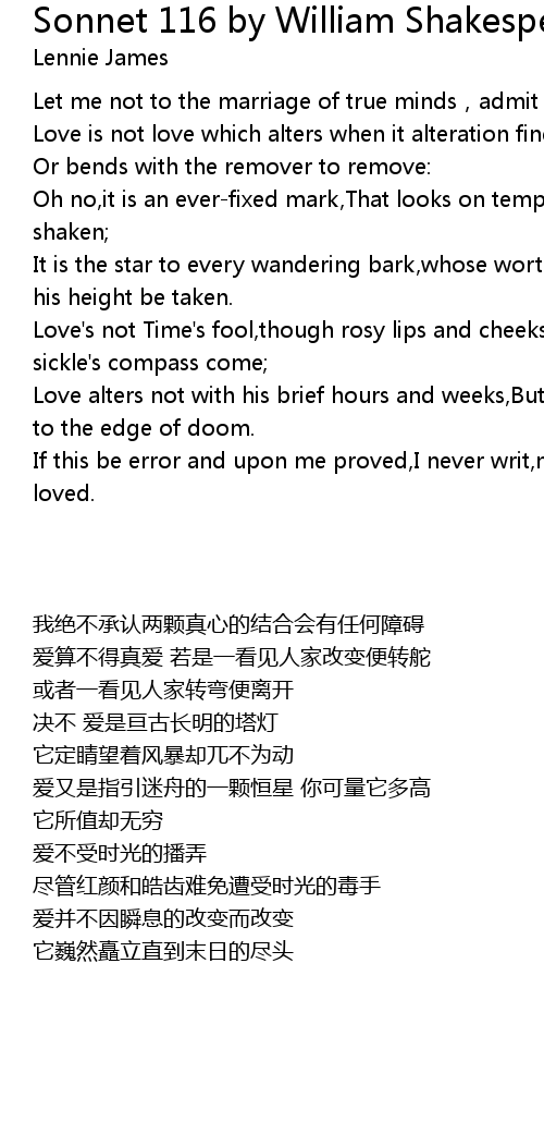 | [00:10.22] | Let me not to the marriage of true minds,admit impediments. |