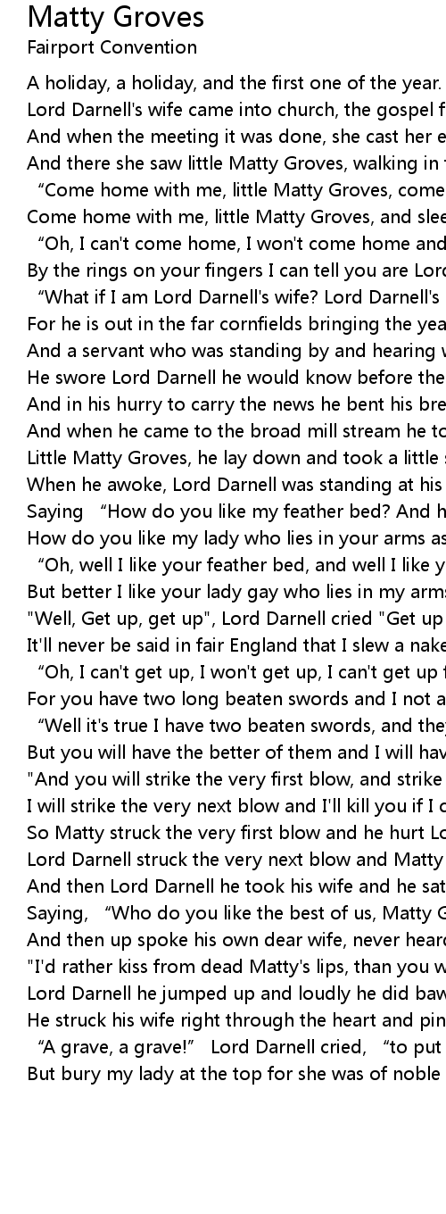 | Saying, " Who do you like the best of us, Matty Groves or me?" | |