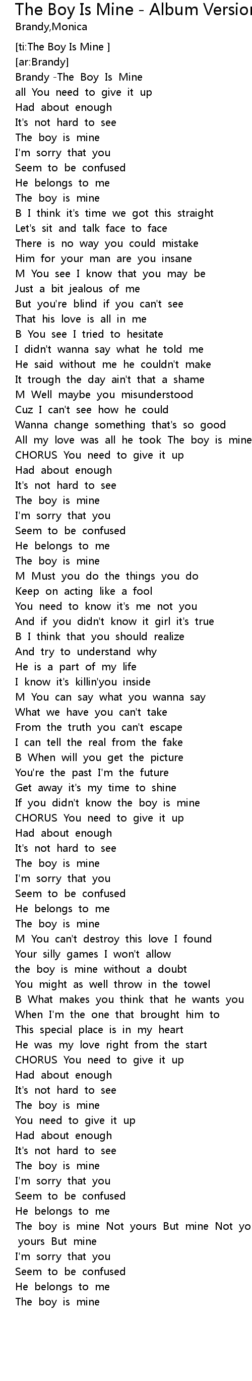 | [03:32.502] | The boy is mine Not yours But mine Not yours But mine Not yours But mine |