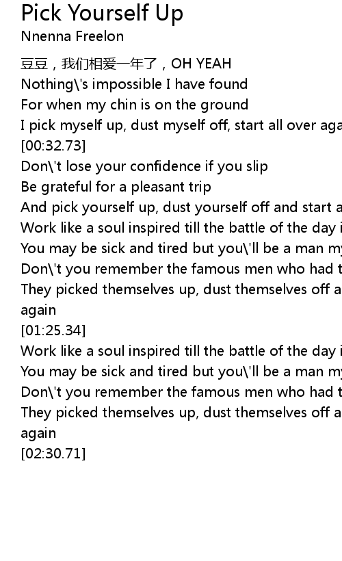 | [00:25.61] | I pick myself up, dust myself off, start all over again |
