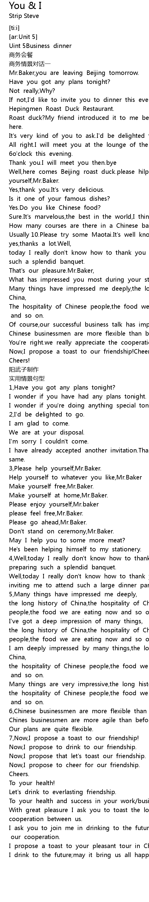 | [00:19.112] | If not,I'd like to invite you to dinner this evening at Hepingmen Roast Duck Restaurant. |