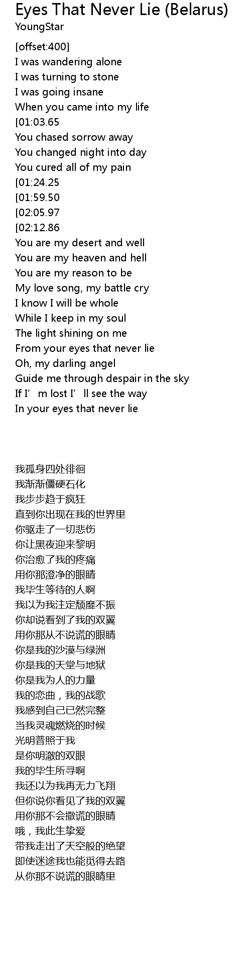| [00:59.95][01:24.25][02:19.81] | With your eyes that never lie |