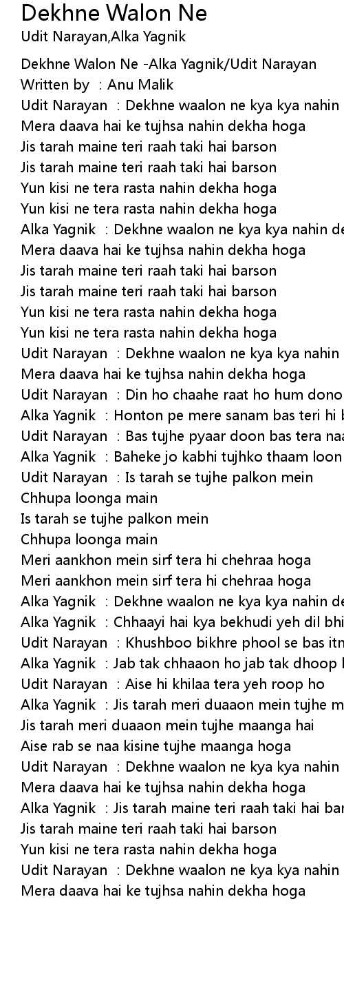 | [00:00.178] | Dekhne Walon Ne -Alka Yagnik/Udit Narayan |
