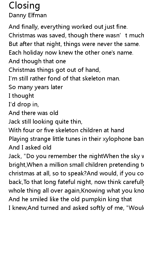 | Jack, " Do you remember the nightWhen the sky was so dark and the moon shone so bright, When a million small children pretending to sleep, Nearly didn' t have christmas at all, so to speak? And would, if you could, turn that mighty clock back, To that long fateful night, now think carefully, Jack, Would you do the whole thing all over again, Knowing what you know now and what you knew then?" | |