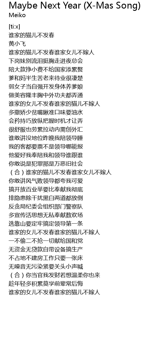 | [00:50.735] | shuí jiā de nǚ ér bù fā chūn shuí jiā de māo ér bù jià rén |