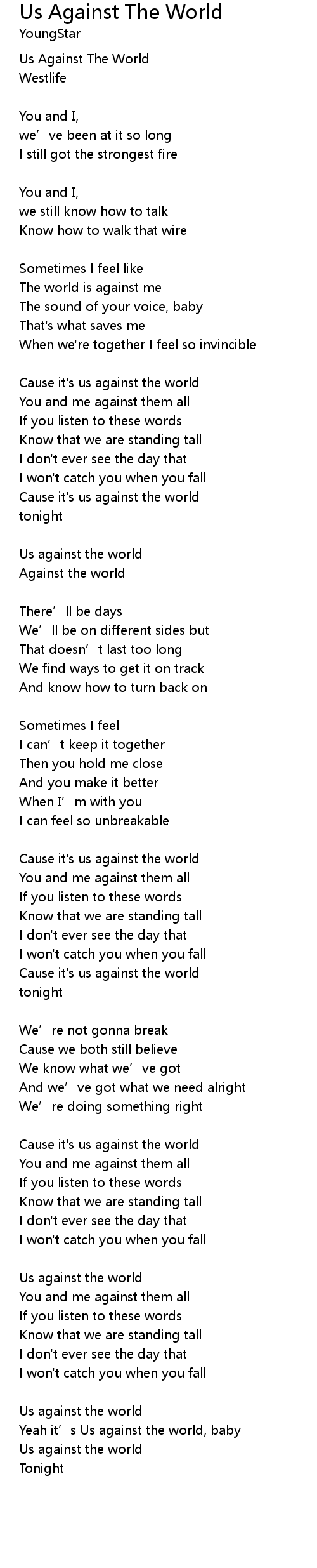 | Cause it' s us against the world | |
