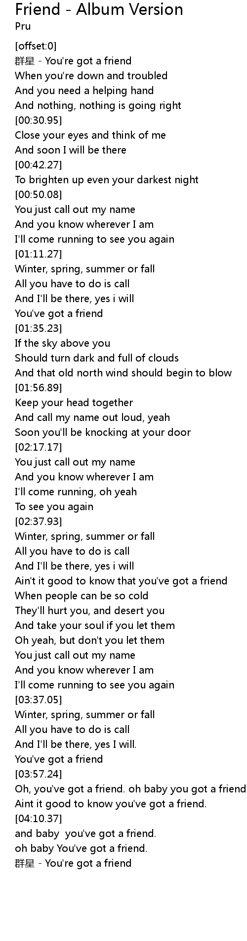 | [04:10.88] | and baby you've got a friend. |