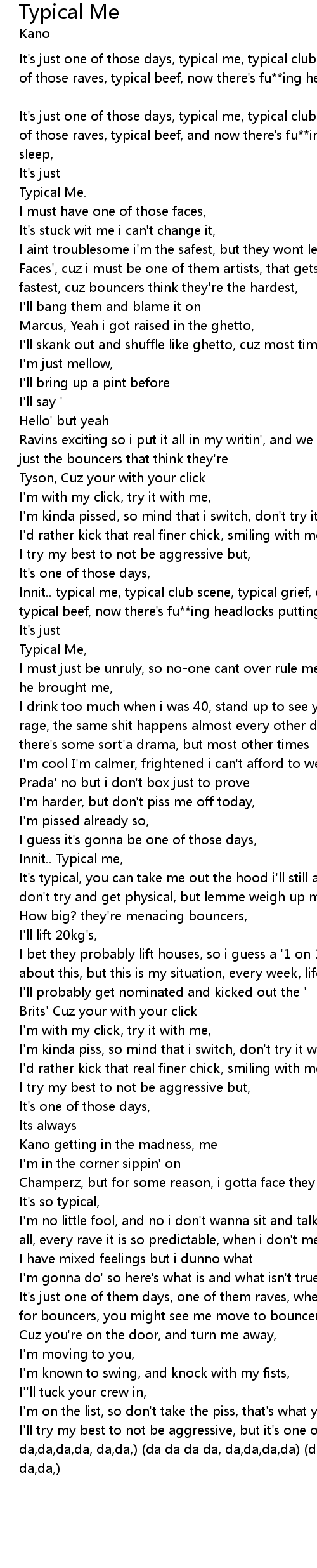 It's just one of those days, typical me, typical club scene, typical grief, one of those raves, typical beef, now there's fu**ing headlocks putting me to sleep, |