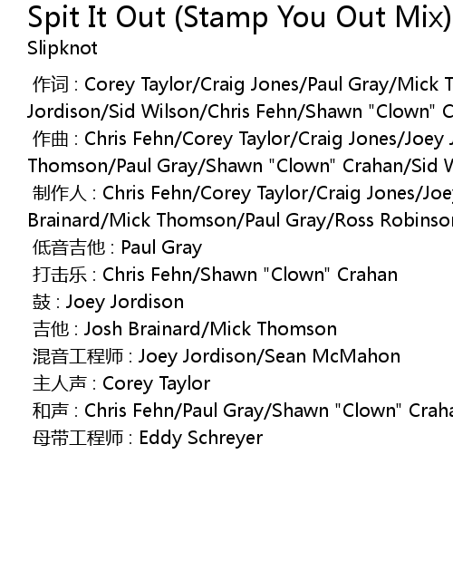 | [00:00.000] | zuò cí : Corey Taylor Craig Jones Paul Gray Mick Thomson Joey Jordison Sid Wilson Chris Fehn Shawn " Clown" Crahan |