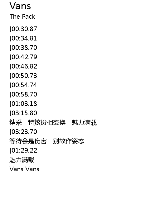 | [03:32.07][03:15.80][02:28.86][02:12.35][01:11.60] | Vans 精采 特炫扮相变换 魅力满载 |