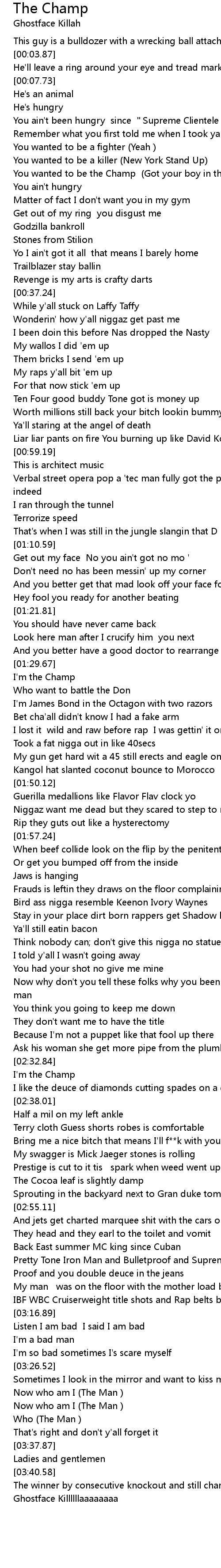 | [00:21.51] | You wanted to be the Champ (Got your boy in the booth nigga) |