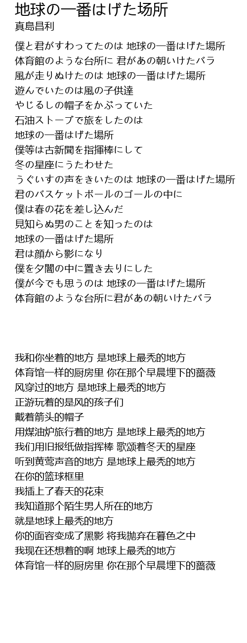 | [00:11.992] | 僕と君がすわってたのは 地球の一番はげた場所 |