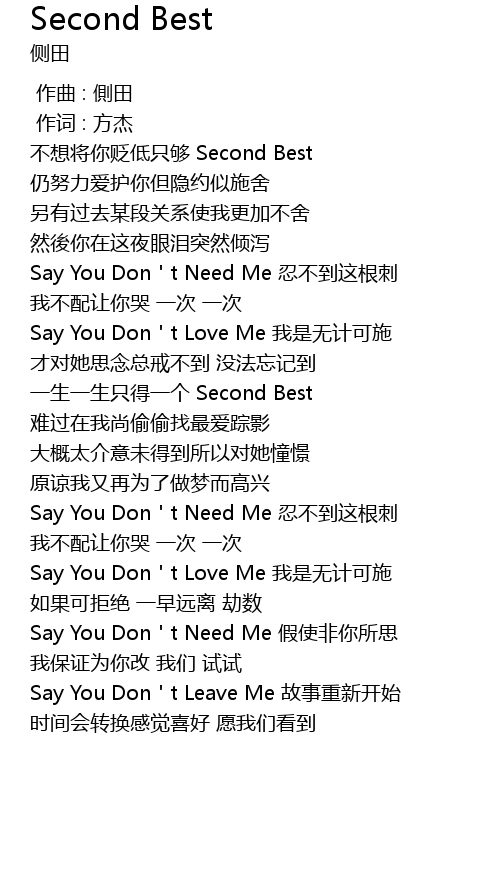 | [00:15.12] | 不想将你贬低只够 Second Best |