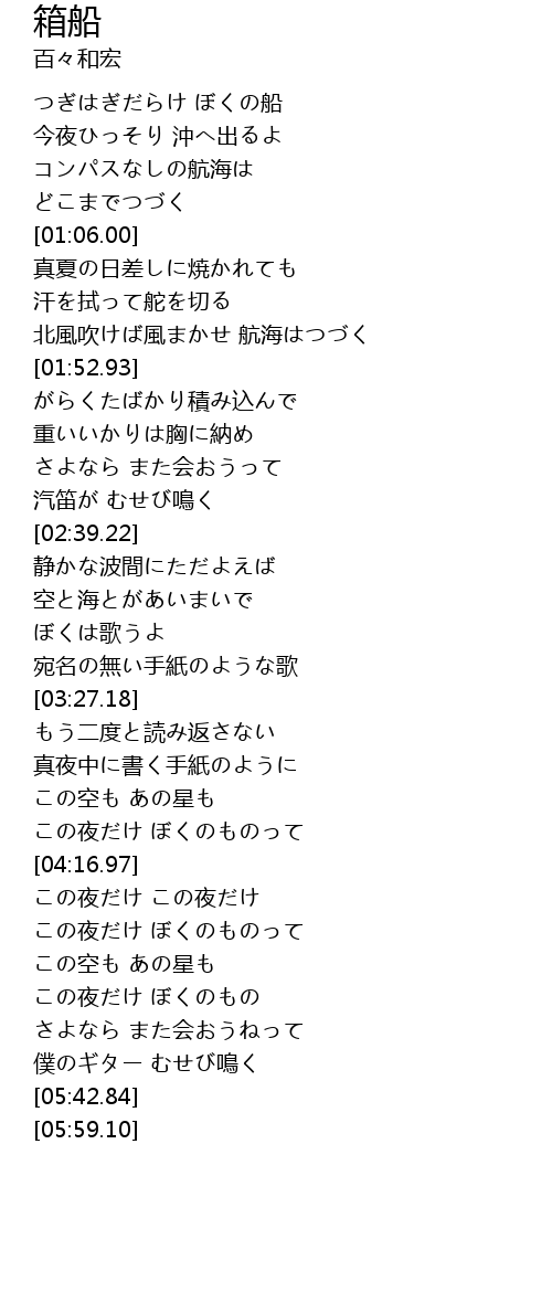 | [00:25.44] | つぎはぎだらけ ぼくの船 |
