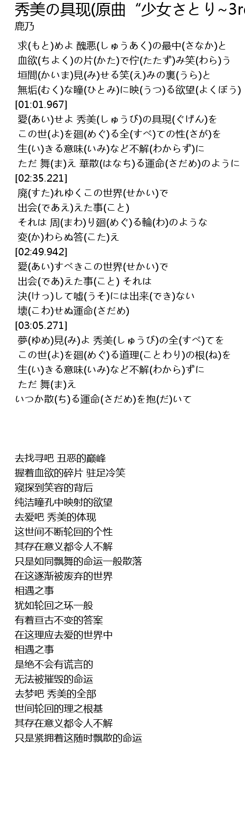 | [02:04.646] | 愛(あい)せよ 秀美(しゅうび)の具現(ぐげん)を |