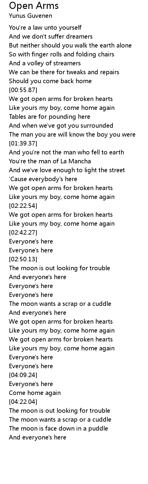 We got open arms for broken hearts |