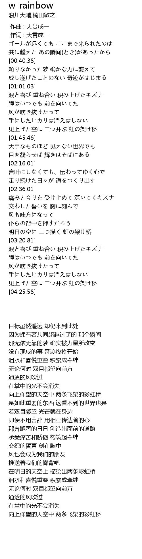 | [04:13.06] | 见上げた空に 二つ并ぶ 虹の架け桥 |