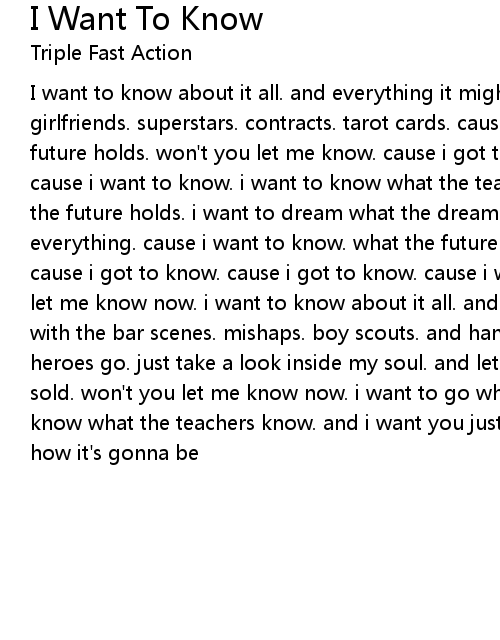 I want to know about it all. and everything it might involve. with the girlfriends. superstars. contracts. tarot cards. cause i want to know. what the future holds. won't you let me know. cause i got to know. and just let me know. cause i want to know. i want to know what the teachers know. i want to hold what the future holds. i want to dream what the dreamers dream. and then scream about everything. cause i want to know. what the future holds. won't you let me know. cause i got to know. cause i got to know. cause i want to know. but won't you let me know now. i want to know about it all. and everything it might involve. with the bar scenes. mishaps. boy scouts. and hand claps. i want to go where the heroes go. just take a look inside my soul. and let me know if it's already been sold. won't you let me know now. i want to go where the heroes go. i want to know what the teachers know. and i want you just to tell me. if this is really how it's gonna be |
