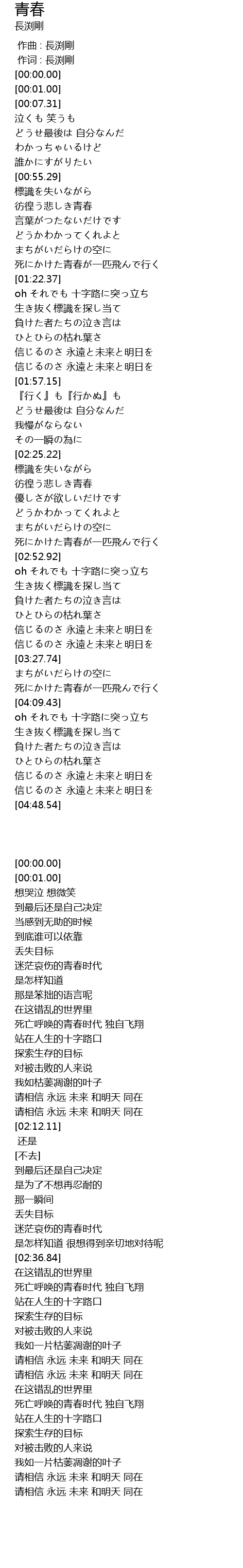 | [04:03.39] | 死にかけた青春が一匹飛んで行く |