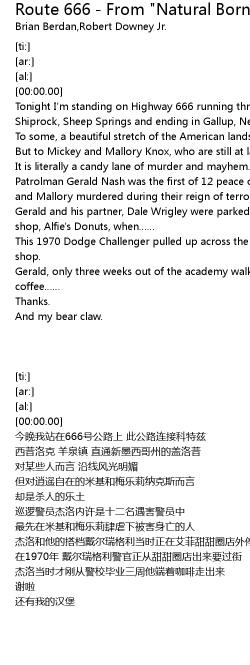 | [00:24.93] | Patrolman Gerald Nash was the first of 12 peace officers that Mickey and Mallory murdered during their reign of terror. |